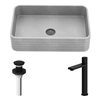 Elevate your bathroom's aesthetic with the VIGO Cadman collection, featuring a striking rectangular vessel sink and matching faucet combo. The sleek 21-in. L X 14-in. W sink is crafted from our proprietary ConcretoStone TM material in a sophisticated ash gray hue. This non-porous, solid-core construction resists chips and stains while maintaining a smooth, elegant surface that's easy to clean and built to last. The sink's modern design is accentuated by its textured exterior, adding depth and visual interest to your bathroom decor. Paired perfectly with the Nova faucet in a bold matte black finish, standing at 10-in. tall, this combination creates a cohesive and contemporary look. The minimalist faucet design complements the sink's clean lines, while its high-quality construction ensures durability.