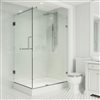 - CORNER SHOWER KIT: Premium corner shower with 48" L X 36" W X 79" H hinged glass, available in chrome or brushed nickel finishes, right drain, textured base, 33" walk-through entry.
