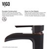 Squared corners exhibit elemental design with The Vinca Matte Stone Bathroom Sink Set with Niko Vessel Faucet by VIGO. Antique rubbed bronze hardware adds contrast and luxurious detail to VIGO’s exclusive Matte Stone material. Smooth textures and clean lines envelop bath décor with elegant dimension. The sink’s polished interior reveals a seamless surface that ensures easy cleaning. The single handle bathroom faucet provides easy operation. The set is complete with the matching pop-up drain.