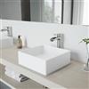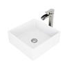 Solid and sturdy, the VIGO Dianthus Matte StoneTM Vessel Bathroom Sink Set with Niko Vessel Faucet is nothing if not stately. Large and square in shape, this sink features 1/2 inch thick Matte StoneTM material, unique to the VIGO brand. Paired with this sink is the sleek, trough-style vessel Niko Faucet, outfitted in a 7-layer coated brushed nickel finish. Both the faucet and sink expertly resist impact and scratches due to their impeccable construction. A complementary pop-up drain in a matching brushed nickel finish completes this stunning artistic bathroom sink set.