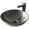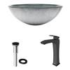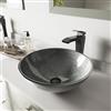 Touches of shimmer add illuminating charm to The Simply Silver Glass Vessel Bathroom Sink Set with Blackstonian Vessel Faucet by VIGO. Matte black hardware perfectly complements metallic hues and provides contrast for thick, tempered glass. The polished interior and textured exterior of the sink ensures easy cleaning and long-lasting durability. The vessel faucet delivers a cascading flow of water that promises a luxurious bathroom experience. This set is complete with the matching pop-up drain and mounting ring.