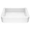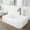The VIGO Petunia vessel sink showcases a modern, minimalist design that enhances any bathroom decor. This rectangular sink measures 23-in. L x 16-in. W x 5-in. H, offering a spacious basin with clean lines and a sleek profile. The matte white finish gives it a contemporary look that complements various styles, from traditional to modern. Made from durable MatteStoneTM, this sink resists scratches and stains, making it easy to maintain its pristine appearance. The non-porous surface inhibits bacteria growth, promoting a more hygienic bathroom environment. Its above-counter installation creates a striking focal point, while the versatile design allows for flexible placement on different countertop materials. The sink's smooth, gently sloping interior ensures efficient water drainage, combining functionality with aesthetic appeal. VIGO's commitment to quality is evident in the sink's solid construction and refined edges.