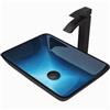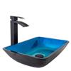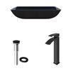 Tranquil hues of blue convey a scenic inspired motif for The Rectangular Turquoise Water Glass Vessel Sink and Duris Vessel Bathroom Faucet Set. Solid brass constructed hardware with a matte black finish adds a handsome contrast to its glass counterpart. Its polished interior provides a glossy finish and makes it easy to clean. Seamless operation is supported by the single handle bathroom faucet, making it easy to control water flow and temperature. The set is complete with the included pop-up drain and mounting ring in a matching finish.