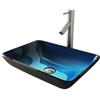 The new VIGO Turquoise Water rectangular glass vessel bathroom sink with Dior faucet brings two uniquely designed products together in one impeccable combination. The hand-painted vessel sink is made from solid tempered glass, keeping it safe and resilient to dangerous shards and breakage. The sink has a smooth, polished interior and a textured exterior, which helps it withstand scratches and makes it easy to clean. The sink pairs perfectly with the VIGO Dior vessel faucet, a single-handle model with a premium hardware coating that gracefully resists wear and tear. This set will impress you with its premium hardware and a complementary, matching pop-up drain.