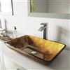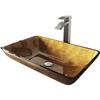 With its curved corners and hand painted details The Rectangular Copper Glass Vessel Bathroom Sink Set with Duris Vessel Faucet by VIGO adds inspiration to bathroom décor. Brushed nickel finished hardware and a blend of metallic hues adds richness and depth to the tempered glass of the vessel sink. Handcrafted with care, every element delivers long-lasting beauty and performance. The set it made complete by the pop-up drain with matching finish, it ensures flawless draining and prevents water from pooling.