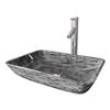 The VIGO Titanium rectangular glass vessel bathroom sink with Dior faucet brings two uniquely designed products together in one impeccable combination. The hand-painted vessel sink is made from solid tempered glass, keeping it safe and resilient to dangerous shards and breakage. The sink has a smooth, polished interior and a textured exterior, which helps it withstand scratches and makes it easy to clean. The sink pairs perfectly with the VIGO Dior vessel faucet, a single-handle model with a premium hardware coating that gracefully resists wear and tear. This set will impress you with its premium hardware and a complementary, matching pop-up drain.