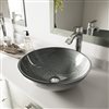 VIGO presents the Simply Silver Glass vessel bathroom sink. It is built from solid tempered glass that is highly safe for everyday use by families. The glass is also resilient to scratches, is non-porous, and prevents fading over time. Thanks to its polished interior and textured exterior, the Simply Silver Glass sink doesn't stain and is easy to clean. Its hand painted detailing ensures that no two sinks will ever be exactly alike. This sink can be paired with any VIGO vessel or waterfall faucet to make a complete set. Its brushed chrome detailed interior and smooth-looking exterior give the bathroom a sleek, modern look.