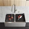 The VIGO 33-Inch Oxford Slotted Apron Front Double Bowl Stainless Steel Farmhouse Kitchen Sink with Accessories is an innovative twist on the kitchen workstation. Handmade from durable, eco-friendly 304 stainless steel, the VIGO Oxford set features a double bowl sink with a sleek black plastic cutting board, roll-up silicone drying rack, 2 round drain covers, 2 kitchen sink strainers, and 2 stainless-steel bottom grids. The shock-absorbent, soundproof base keeps your space quiet even as you clean pots and pans. Rust-resistant, the VIGO Oxford will maintain all of its lustrous qualities over time, making it the perfect addition to your kitchen.