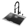 Taking kitchen design to unexpected levels, VIGO reinvents the stainless steel kitchen sink with The Hampton exclusive kitchen sink set. Influenced by some of the most professional kitchens, The Hampton is a chef-inspired workstation that integrates a multifunctional tier into its design. It's the perfect kitchen workstation for meal prep, cooking, and cleaning. This all-in-one kitchen sink set includes the best-selling Edison pull-down kitchen faucet in matte black, a coordinating soap dispenser, colander, cutting board, silicone bottom grids, and a strainer. Constructed with stainless steel, the drop-in kitchen sink provides lasting durability and performance. Elevate the functionality and convenience of your kitchen with a multifunctional kitchen workstation that gives you the tools to do more.