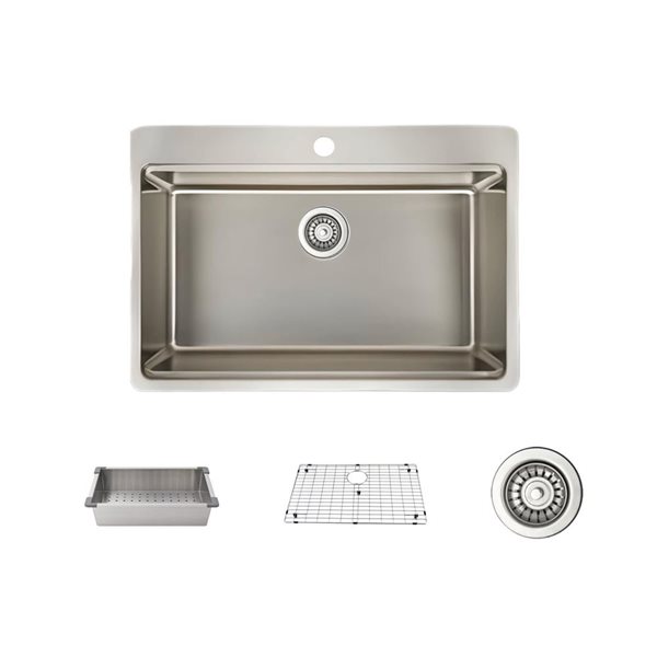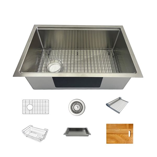 • INCLUDED COMPONENTS: The Oxford workstation sink includes a 304-series stainless steel sink, black cutting board, roll-up silicone drying rack, stainless steel strainer, and protective bottom grid.