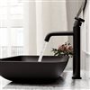 Handsomely curated, The Black Sottile Matte Shell Vessel Bathroom Sink with Faucet Set by VIGO delivers contrasting textures and sleek silhouettes. Constructed from VIGO’s proprietary Matte Shell, the rectangular vessel bathroom sink features curved corners and a smooth surface. The Ruxton Bathroom Vessel Faucet adds industrial charm to the vessel sink’s matte black composite with a hexagon-shaped single wheel handle, diamond knurling details, and a matte black hardware finish. The set is complete with a matching pop-up drain.